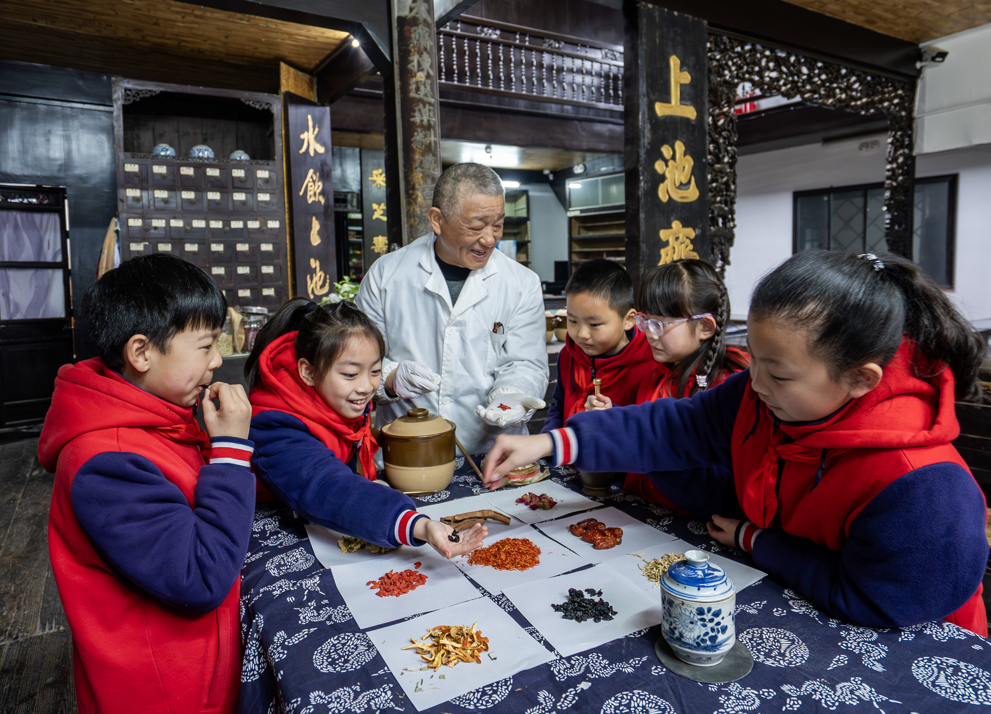3月17日,在江苏省兴化市昭阳街道上池斋药店,兴化市景范学校学生在中药师的指导下学习中草药知识。